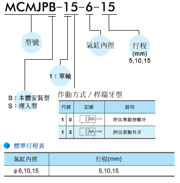 - Bores: φ 6, 10, 15 mm, model: MCMJPB ( Body-mounted type ), MCMJPS ( Embedded type ).