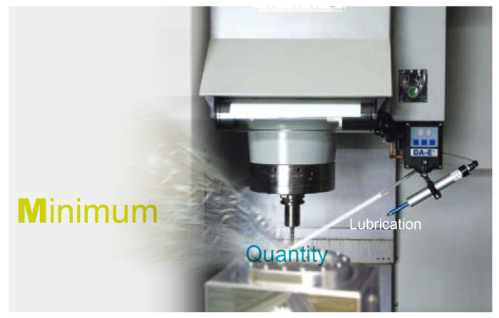 搭載 CS - 50 伸縮噴嘴可改善在數控加工中心機上使用 的 MQL 微量潤滑系統其噴嘴需設在刀具前端 ,更換刀 具長短不一時噴嘴無須操作員重新調整 。